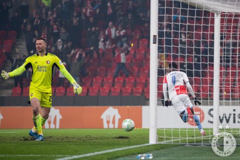 In the 28th minute, Feyenoord won the ball in the middle of the pitch by pressuring Slavia and started a quick attacking move, resulting in Dessers’ shot from far out that Mandous managed to push out for a corner kick. Til’’s header from said corner kick was then also saved by Mandous.