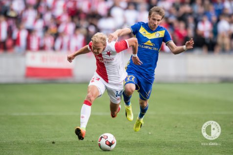 PRAGUE/EDEN ARENA - Slavia defeated BATE in the first leg of UEFA Champions League 3rd qualifying round. BATE was down to ten men from 15th minute, but the narrow 1-0 victory was achieved only thanks to Škoda´s converted penalty kick.