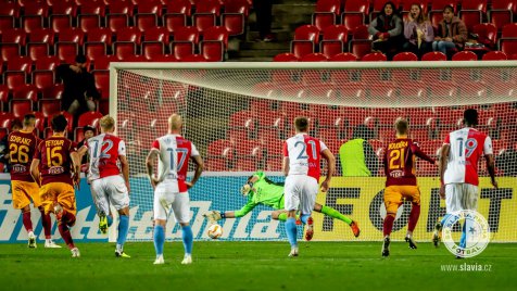 Slavia could score just 2 minutes into the game, but Baluta missed with his bicycle kick following Matoušek’s shot punched away by goalkeeper Rada. However, 14 minutes into the game the red-whites opened the score when Olayinka sent long cross from the left wing and Vladmír Coufal fired his volley through Rada.