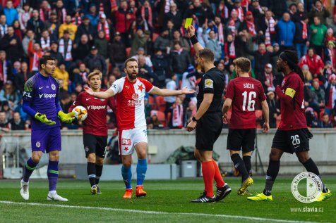Slavia started with Škoda as lone striker and with 5 overall changes in compare to Europa League game with Chelsea on Thursday. The 291st mutual game against our city rivals started in great pace and with many tackles and 1-on-1 duels from the very first minute.